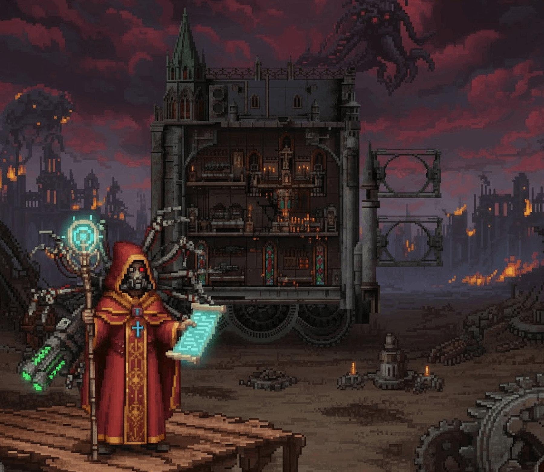 Craft your Holy Machine (The Mobile Cathedral) from Altars, Soul Cages, and other sanctified parts. Link its inner systems into a living, gothic labyrinth that drinks the souls you reap. Shape the arcane conduits, transform raw psychic energy, and awaken sacred chambers until the whole contraption thrums with holy purpose and righteous fury.